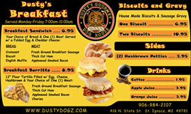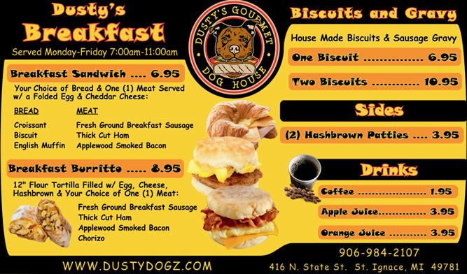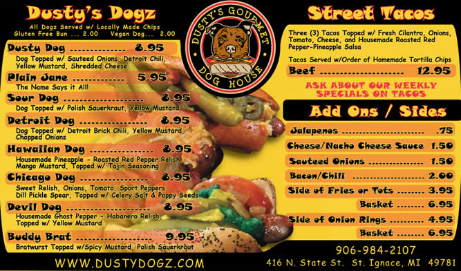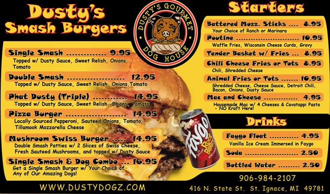 Located in St. Ignace, MI, Dusty's Dogz has Gourmet Hot Dogs with unique toppings, Smash Burgers and more. Made with Michigan products for the Michigander to enjoy. We are proud to serve locally sourced products, including: